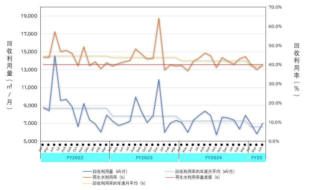 将再生水利用率基准值设为40%,每月统计再生水利用率,确认其推移。