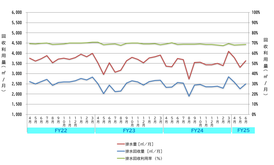 设定了回收利用水资源的数值目标,努力开展有效利用水资源的活动。具体来说,在用水量大的半导体前工序工厂中统计超纯水制造中再生水的利用量和利用率,且每个月进行评估和调整,实现了水资源的有效利用。
