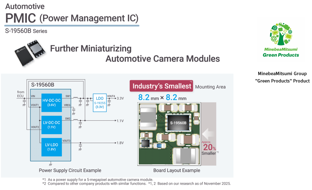 美蓓亚三美株式会社(MinebeaMitsumi Inc.) 旗下的艾普凌科有限公司(总裁:田中诚司,总部地址:东京都港区,下称“ABLIC”)今天推出面向车载相机模组的16V工作、3通道输出的电源管理IC(下称PMIC)「S-19560B系列」。