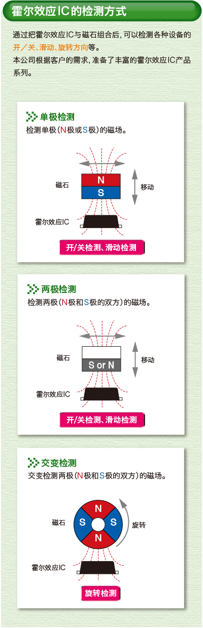 霍尔效应开关IC是通过半导体传感器将磁性的強弱转变为电气信号的IC。检测磁性的方式有“单极检测型”、“两极检测型”和“交变检测型”的3种类型,采用各种检测方式的霍尔效应开关IC具有如下的特点: