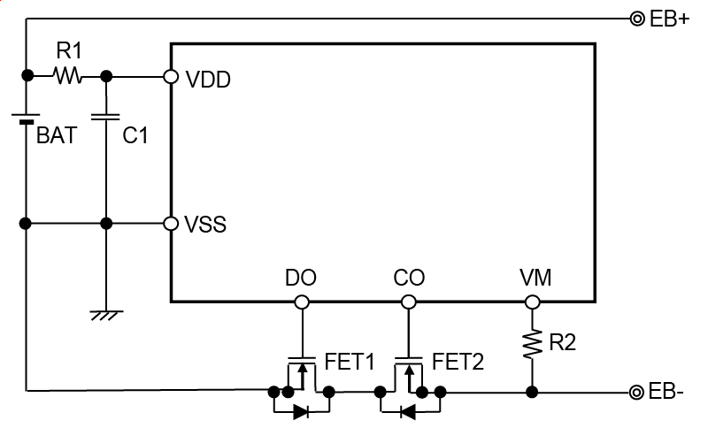 - 放电过电流状态的解除电压 : 放电过电流解除电压 (VRIOV) = VDD × 0.8 (typ.)