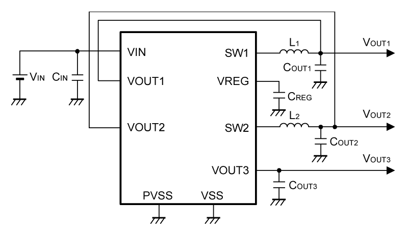各个输出都内置有保护IC和线圈免受过大负载电流影响的过电流保护电路,防止因发热导致IC受损的热敏关闭电路。各个输出的启动序列固定在IC内部,因此无需通过外部信号进行控制,只需接通电源即可自动、安全地提供给各个输出电压。