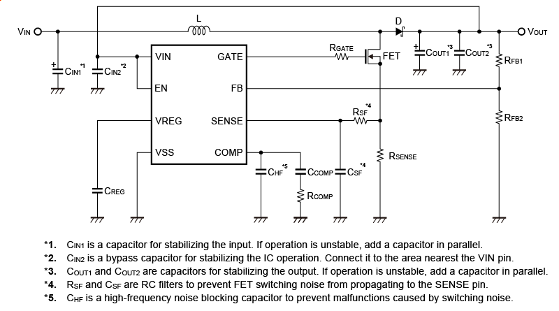 本IC具有3.0 V ~ 36 V宽输入工作范围,适用于车载启停系统、应急备用电池系统。把使用本IC构成的转换器的输出电压 (VOUT)施加到VIN端子的自举 (bootstrap) 结构中,启动后,可以将输入电压扩展到工作输入电压范围以下。