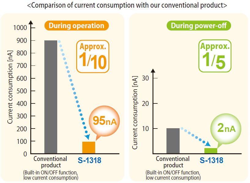 • 工作期间消耗电流:95nA(典型值)