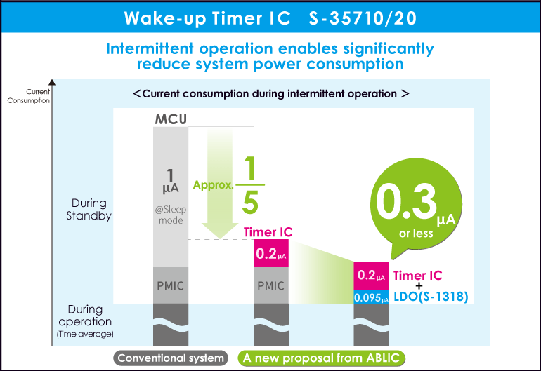 如果使用ABLIC的S-1318系列LDO作为搭载该款IC的电源,则可以使构建一个功耗在0.3μA以下的极低功耗间歇运行系统成为可能。这不仅有助于开发寿命更长、体积小的电池,且为其他超低功耗系统创造了条件。