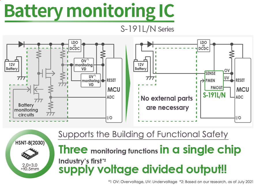 艾普凌科有限公司(ABLIC Inc.,总裁:Nobumasa Ishiai,总部:东京都港区,下称“ABLIC”)今日推出了S-191L/N系列,这是一款车载高耐压电池监测IC,具有行业首创的(*1) 电源分压输出功能。