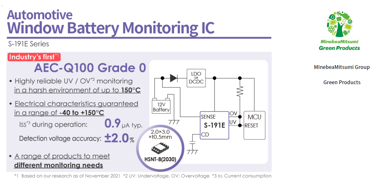 今天推出的S-191ExxxxS系列窗口模式电池监测IC是符合汽车IC质量标准AEC (*3)-Q100 0级(*2)的产品。AEC-Q100标准根据环境工作温度范围,将产品分为0-3级。0级产品要求能够在低至 -40℃的低温环境和高达150℃的高温环境下工作。由于已经通过了针对不同等级的各种压力测试,因此即使在配备控制自动变速器(AT) 的 ECU 或 废气再循环系统 (EGR) 系统的严酷高温环境中,也可以进行高度可靠的电压监控。