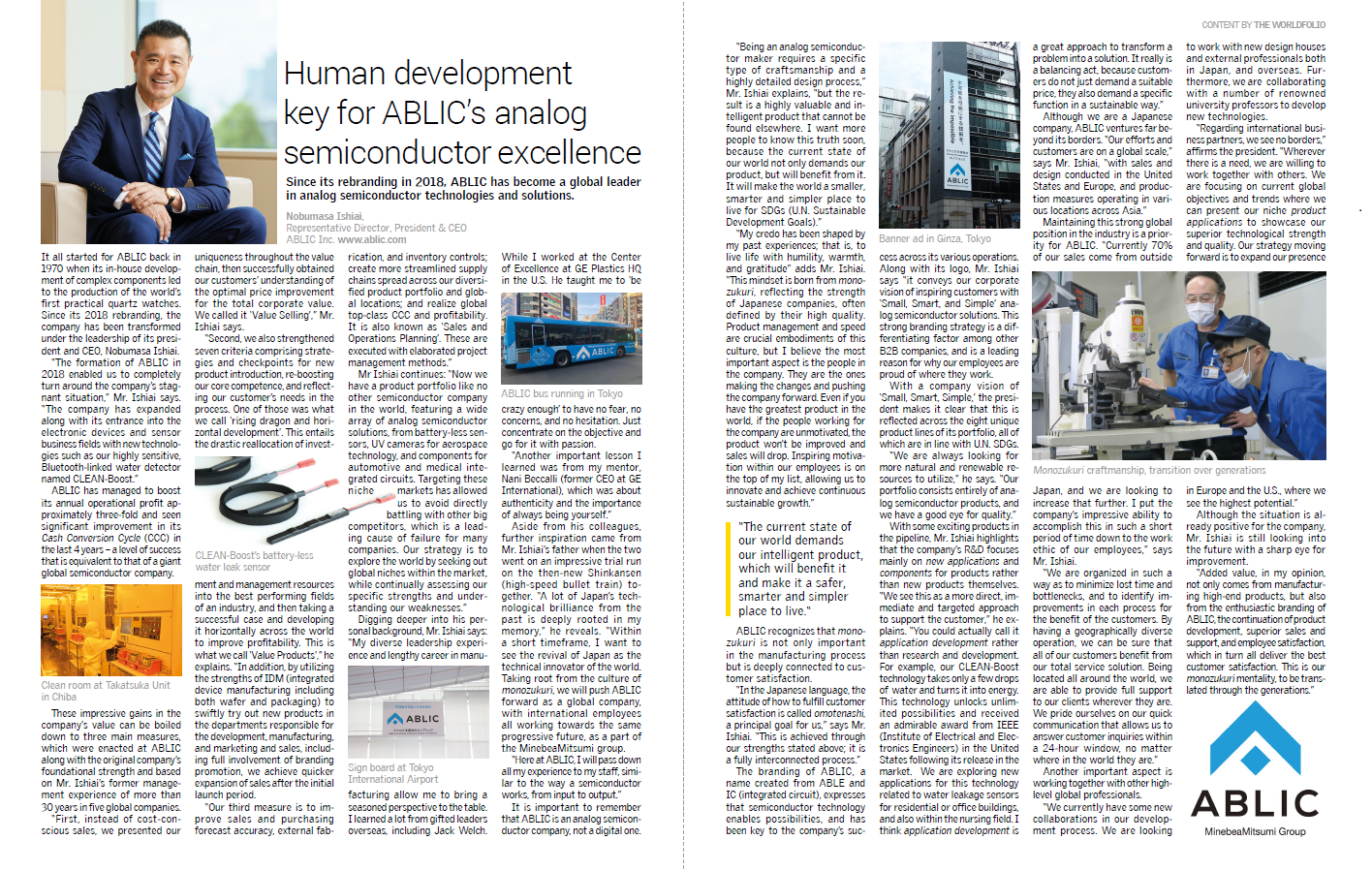 “I would like to give my sincere gratitude to everyone cooperated in this regard since it is very valuable publishment to ABLIC and to myself. I am also very honored that this article was published to the world with ranging with other representative semiconductor companies in Japan, which will make our company value of ABLIC raise further. I am expecting that this one would be a trigger to expand our brand to the world not only to the areas in English as a global company based on ‘People'.”