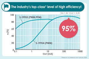 「S-19954/5系列」的高效率在功能相同产品中达到了业界最高水准(在输入电压4V、输出电压3.3V时为95%)的功率转换效率。