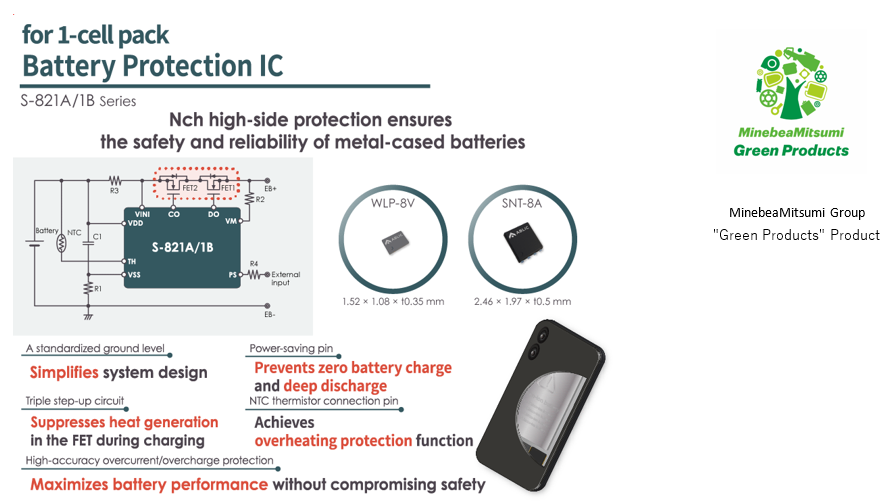 美蓓亚三美株式会社(MinebeaMitsumi Inc.) 旗下的艾普凌科有限公司(总裁:田中诚司,总部地址:东京都港区,下称“ABLIC”)今天推出使用N沟道MOSFET(※1)实现正端保护(※2)的1节电池保护IC「S-821A/1B系列」。