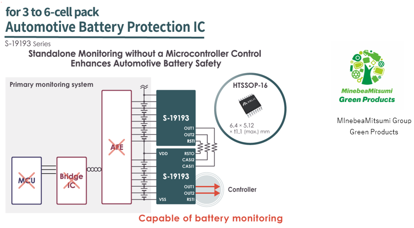美蓓亚三美株式会社(MinebeaMitsumi Inc.) 旗下的艾普凌科有限公司(总裁:田中诚司,总部地址:东京都港区,下称“ABLIC”)今天推出车载3节~6节电池监视用保护IC「S-19193系列」。