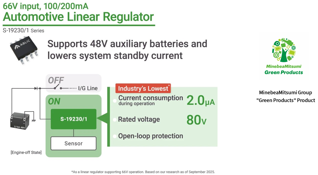 美蓓亚三美株式会社(MinebeaMitsumi Inc.) 旗下的艾普凌科有限公司(总裁:田中诚司,总部地址:东京都港区,下称“ABLIC”)今天推出实现了业界最小(※1)工作时消耗电流的车载用高耐压电压稳压器IC「S-19230/1系列」。