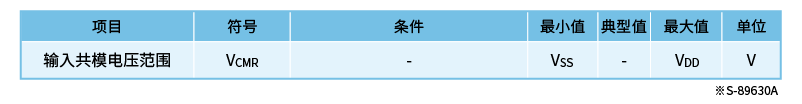 指VDD端子上的能够工作的电源电压的范围。应确认所使用的电源电压是否在运算放大器的工作电压范围内。 operating power supply  voltage range 【输入共模电压范围】