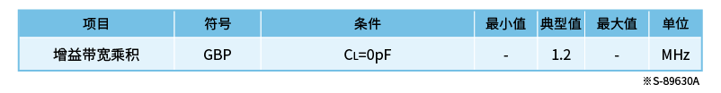 例如,右侧图表表示,增益为1倍(=0dB)时,S-89630A能够放大的最大频率为1.2MHz,增益为10倍(=20dB)时,S-89630A能够放大的最大频率为120kHz。 应确认希望放大的倍率是否在希望方法的最大频率范围内。