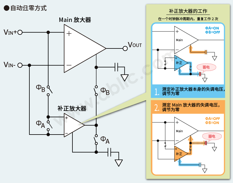 除内置有通常的运算放大器(Main放大器)外,还内置有补正放大器、电容器、信号通道切换开关。 补正放大器用于测定Main放大器的输入失调电压,测定的信号存储于电容器中,并根据该信息对Main放大器实施补正,以抵消输入失调电压。 通过该方式,使输入失调电压无限接近零。 auto-zero amplifier