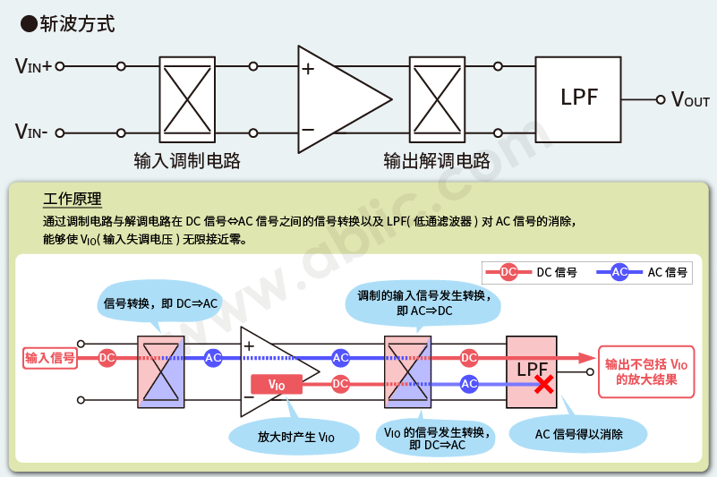 斩波方式的工作原理较为难懂。输入信号通过由开关构成的输入调制电路转换为AC信号,经放大器放大后, 再通过输出解调电路转换回DC信号。 一方面,由于输入失调电压不经过输入调制电路,因此其变成由输出解调电路转换为AC信号后的状态。为此,就可以利用输出部分的LPF(低通滤波器),仅消除转换为AC信号的输入失调电压的信息。 通过该方式,使输入失调电压无限接近零。