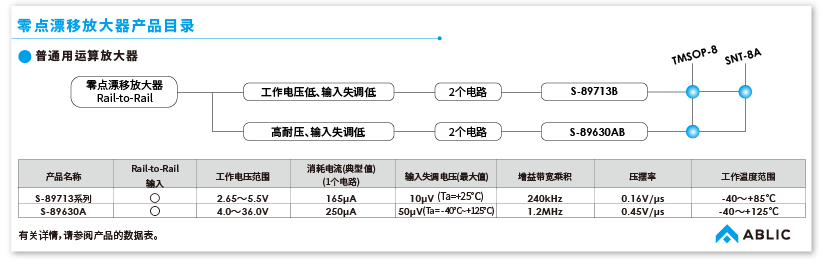 艾普凌科(ABLIC)生产的零点漂移放大器为S-89630AS-89713系列。 Lineup of ABLIC's zero-drift amplifiers
