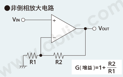 使非倒相放大电路的R2短路 (R2=0Ω)、R1开放(R1=无限大)的电路。 由于VOUT=(1+R2/R1)×VIN= (1+0Ω/∞)×VIN=VIN,因此输入电压与输入信号相同。电压跟随电路用作转换电阻或分离电路的缓冲电路。