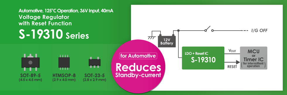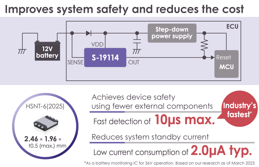 The S-19114 Series exhibits the industry's fastest voltage detection response time of 10µs max. and low current consumption of 2.0µA typ. Improves safety and lower current consumption of automotive devices.