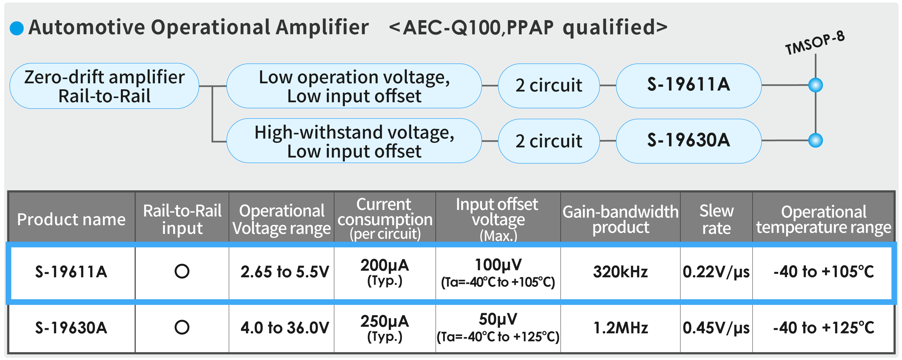 Operational amplifier S-19611A High-accuracy current detection. 5.5V operation, Rail-to-Rail input/output, low offset voltage of 100μV.