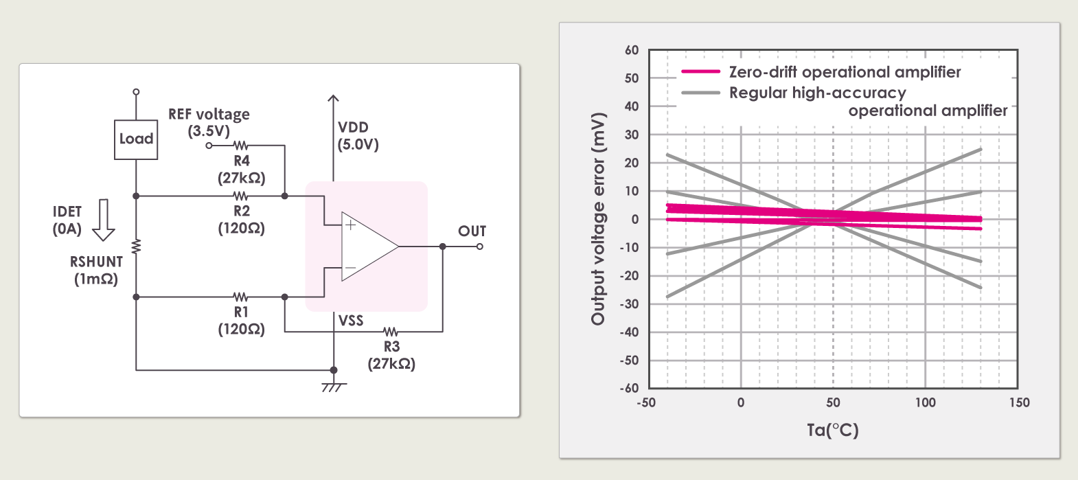 A zero-drift operational amplifier, however, automatically corrects the input offset voltage and even if temperature changes cause the input offset voltage to change, the input offset voltage can at all times be minimized to lower the output voltage error.