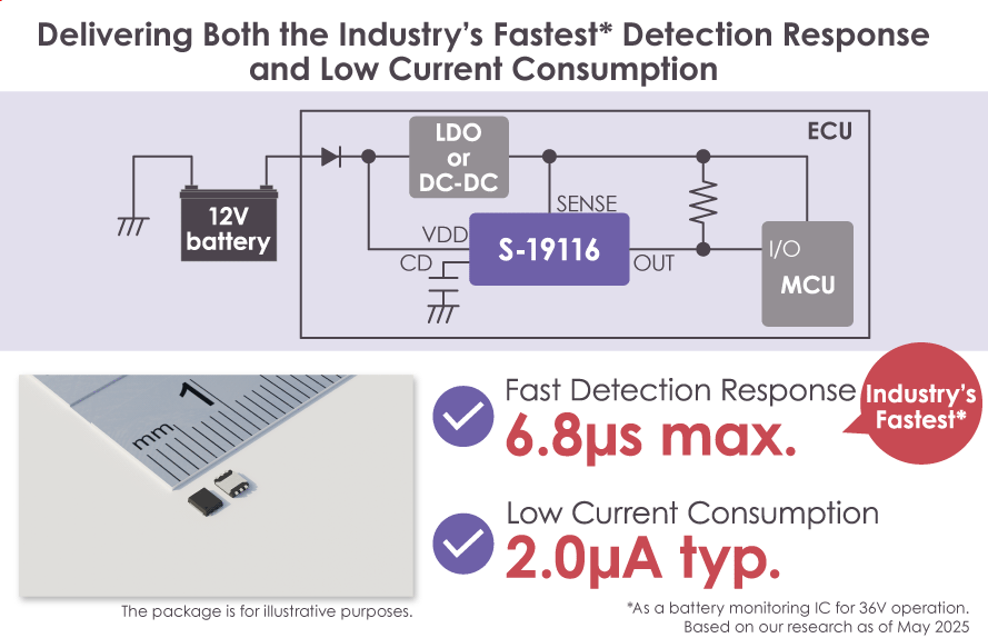 The S-19116 Series exhibits the industry's fastest voltage detection response time of 6.8µs max. and low current consumption of 2.0µA typ. Improves safety and lower current consumption of automotive devices.