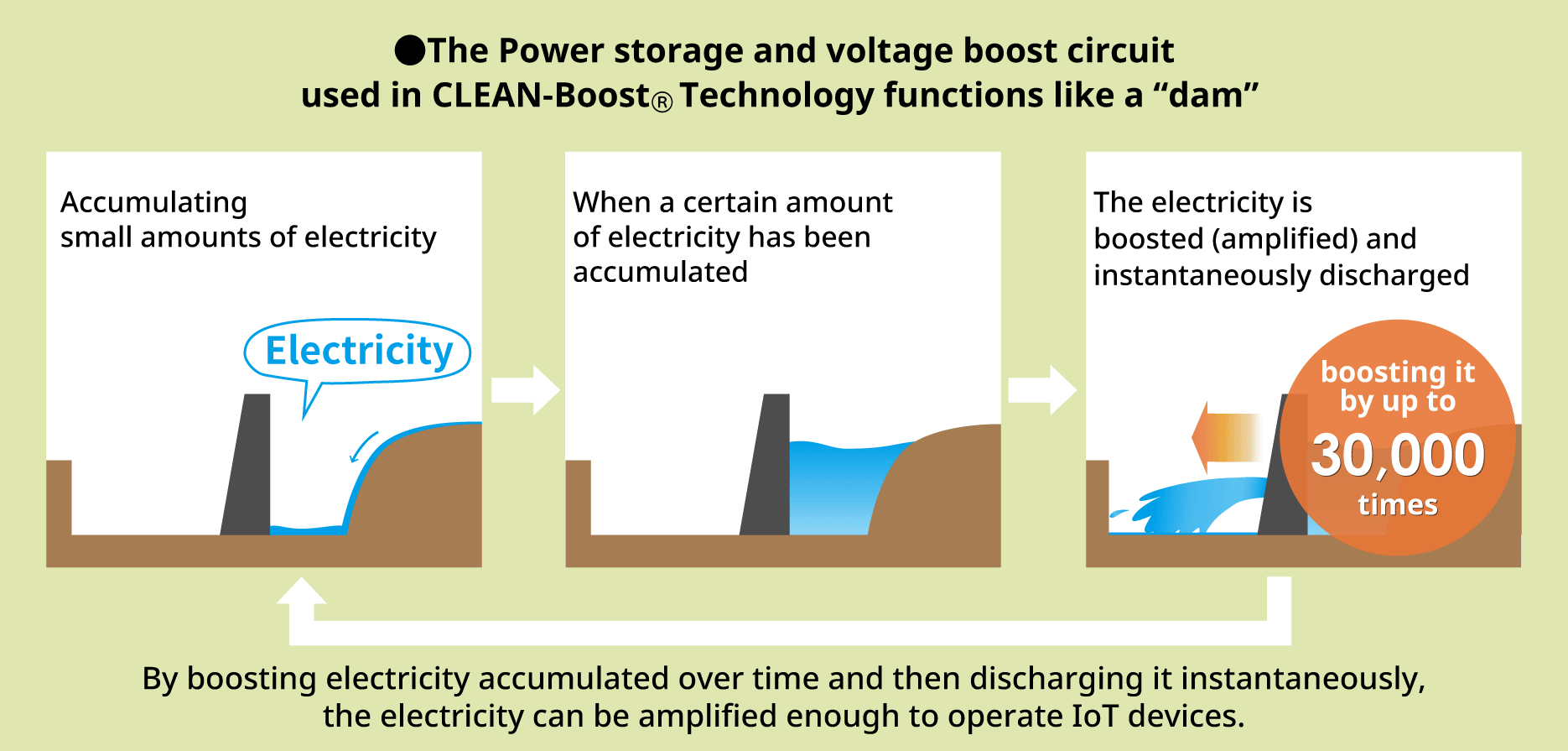 A dam stops the flow of river water and releases it when a certain amount of water has accumulated. Similarly, CLEAN-Boost® accumulates small amounts of electricity and discharges it when a certain amount of electricity has been generated.