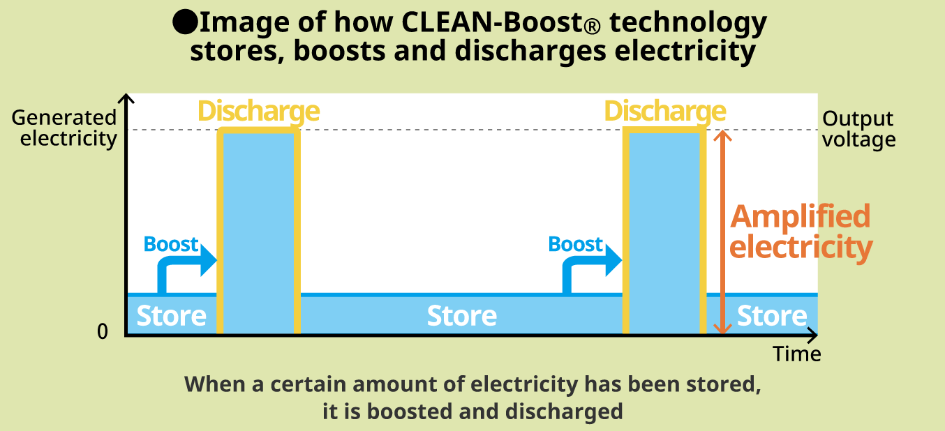CLEAN-Boost® technology is a Power storage and voltage boost circuit technology that boosts small amounts of electricity accumulated over time by discharging it to instantaneously obtain a large amount of electricity.