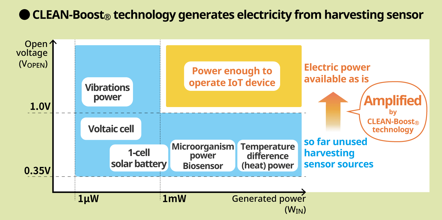 CLEAN-Boost®(*1) technology enables battery-less power generation for IoT devices making it the ideal technology for energy harvesting. CLEAN-Boost® technology exploits tiny sources of harvesting sensor, so far left unused, to operate IoT devices.
