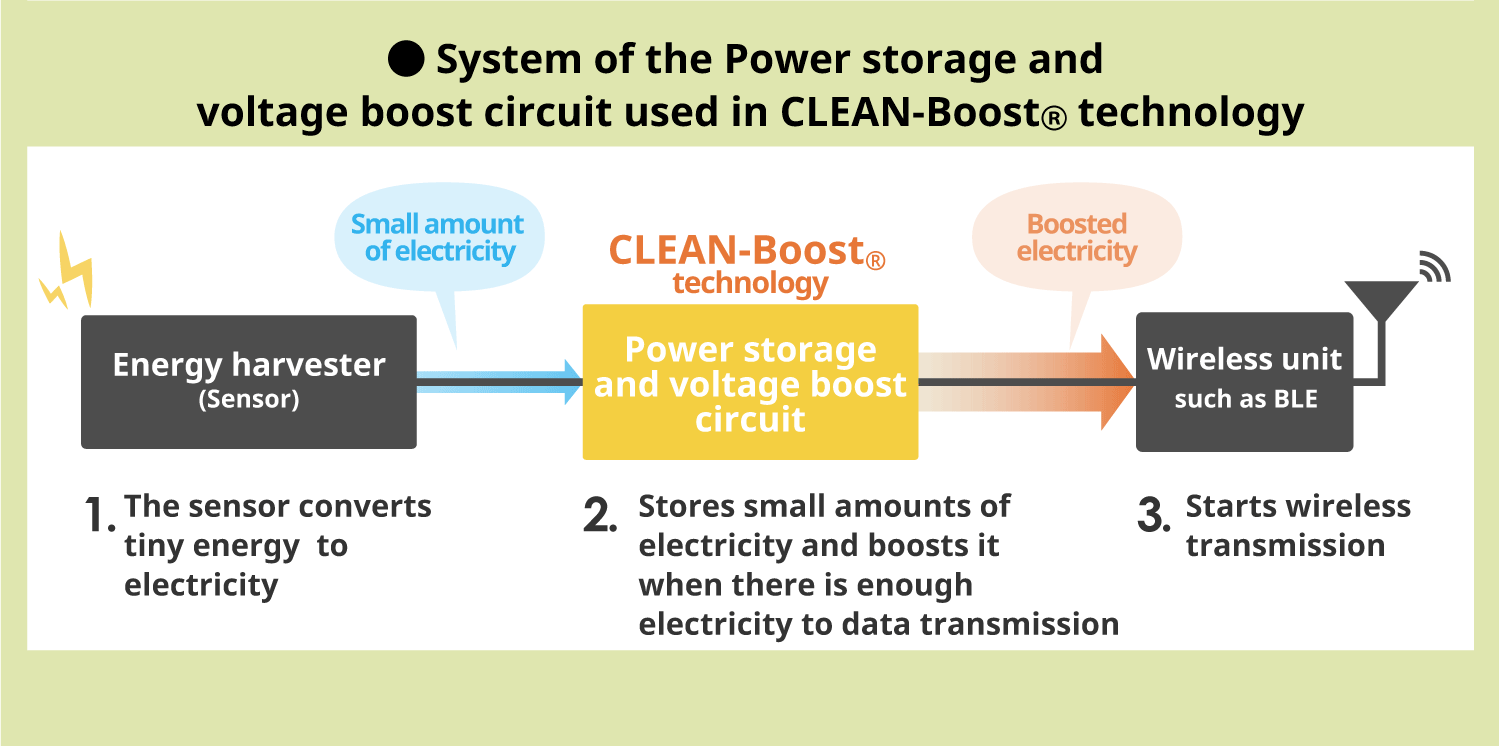 When the Power storage and voltage boost circuit used in CLEAN-Boost® technology is connected to an energy harvester (sensor and generator unit), the small amounts of electricity generated by the sensor are stored in the storage unit of the Power storage and voltage boost circuit.