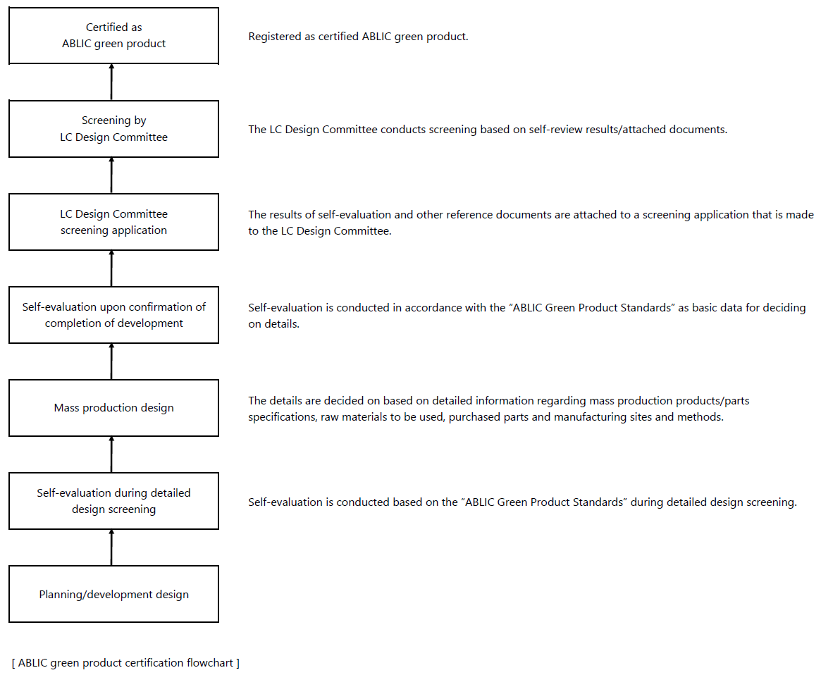Taking our various environmental initiatives into account, we have established green product standards that have been screened by the Life Cycle (LC) Design Committee. These standards incorporate absolute evaluation or relative evaluation with competitor products. Upon the completion of development, each product also undergoes screening by the same LC Design Committee and products that meet the standards are certified as green products.