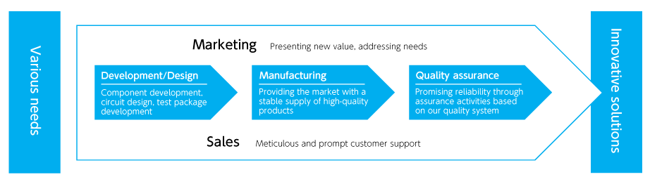 We are a vertically integrated analog semiconductor maker, capable of in-house production from circuit design to manufacturing. We create innovative products that accurately address various potential market needs, and our strength lies in our ability to provide meticulous and comprehensive response to a wide range of customer's different requests. We consistently present new value by providing our customers with solutions that open a path to the future, ranging from the development of components to the designing of circuits, testing, and development of packages.