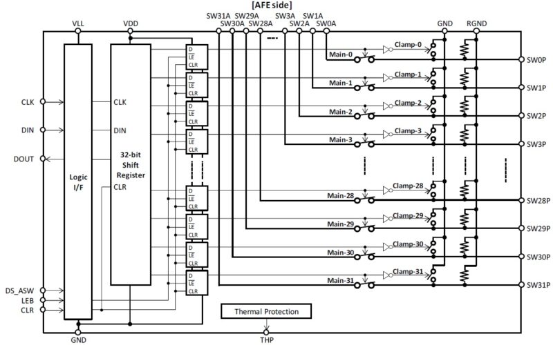 - 32-channel high-voltage SPST analog switch with active ground clamp