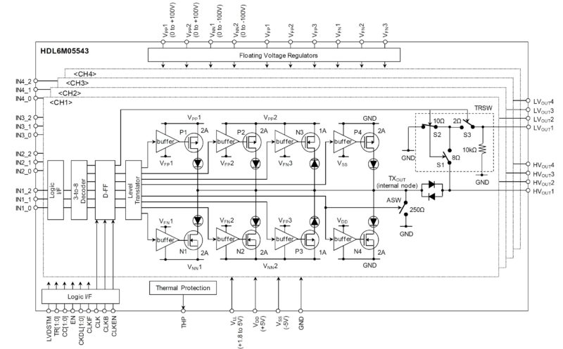The ABLIC Inc. HDL6M05543 is a quad, true 5-level RTZ, high-voltage, high-speed ultrasound pulser. The HDL6M05543 comprises logic interfaces, level translators, MOSFET gate drive buffers with floating voltage regulators, high-voltage, high-current MOSFETs, and active T/R switches.