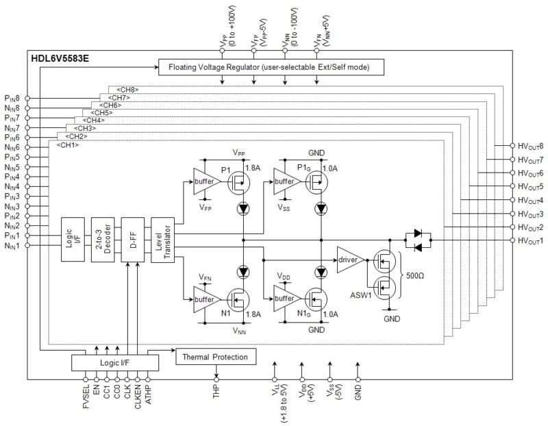The ABLIC Inc. HDL6V5583E is an octal, high-voltage, high-speed fully-integrated pulser for medical ultrasound imaging applications. The HDL6V5583E consists of logic interface, level translators, MOSFET gate drive buffers with embedded/external-selectable floating voltage regulators, and high-voltage, high-current MOSFETs for pulsing and active ground clamping for each channel. The HDL6V5583E is pin-compatible with HDL6V5582/5583.