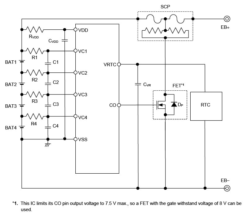 - Overcharge detection delay time, VRTC pin shutdown delay time: 1 s, 2 s, 4 s, 6 s