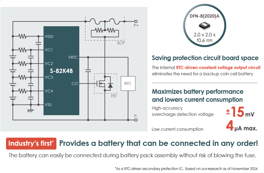 This IC is used for secondary protection of lithium-ion rechargeable batteries, and incorporates high-accuracy voltage detection circuits and delay circuits. The S-82K3B Series enable connection of 3-serial cell, and the S-82K4B Series enable connection of 4-serial cell.