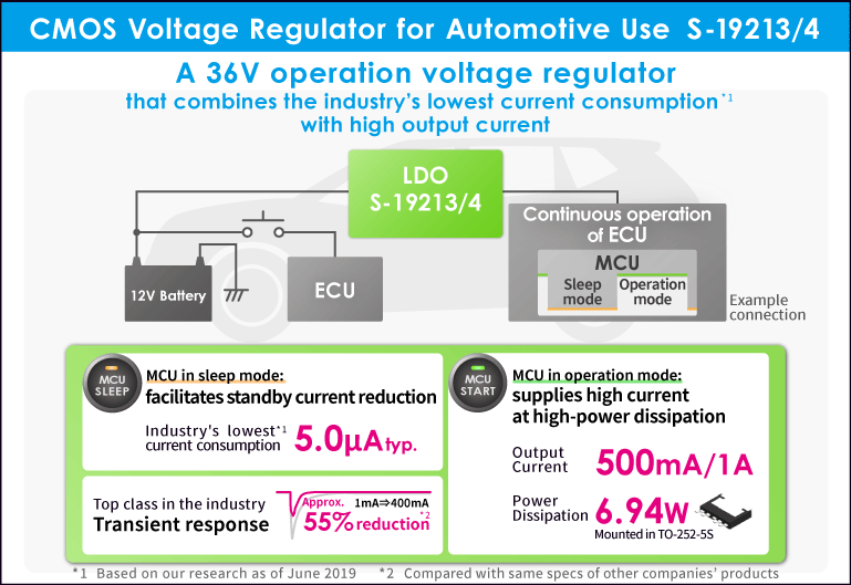 The S-19213/4 Series will serve to lower ECU standby current by balancing the conflicting needs of low self-current consumption and high output current.