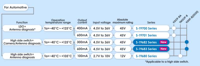 As a one-channel per package product, the S-19682/3 Series uses the industry's smallest (*1) HSNT8(2.0x3.0xt0.5mm) package and therefore has a footprint per channel that is the industry's smallest when compared to multi-channel products. Small size contributes to design freedom and equipped with the earlier mentioned connection diagnosis function, this Series is fully equipped to meet the automotive requirements of the latest ADAS/AD systems.