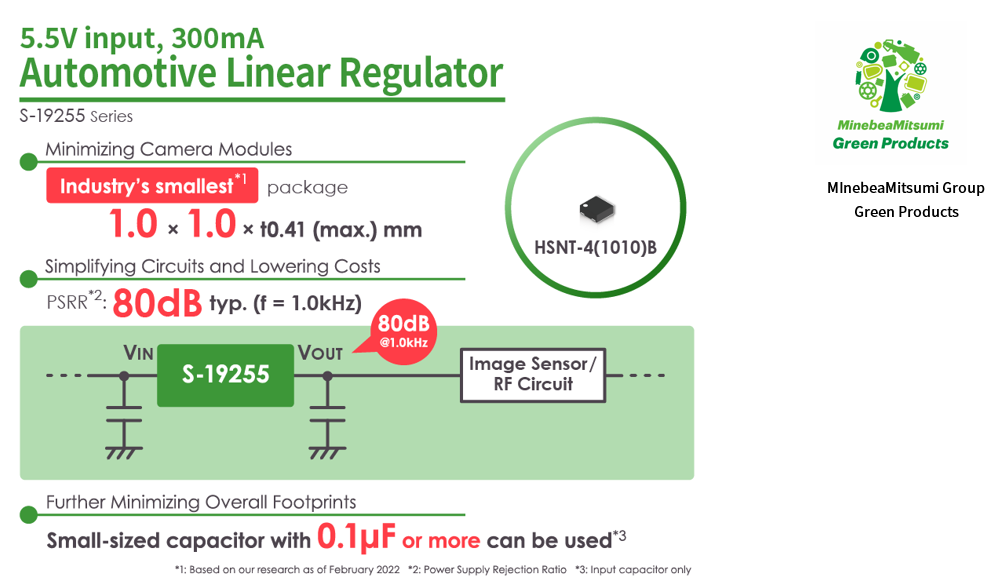 The new S-19255 Series launched today comes in the HSNT-4(1010)B (1.0x1.0x t0.41mm), the industry's smallest package contributing to greater ease of design to flexibly accommodate smaller camera modules.