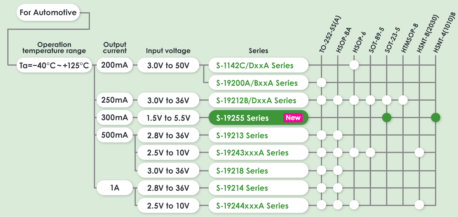 The-S-19255 Series is also PPAP (Production Part Approval Process) capable and planned for compliance with Grade 1 of the AEC (*)-Q100 (*Automotive Electronics Council) quality standard for automotive ICs.