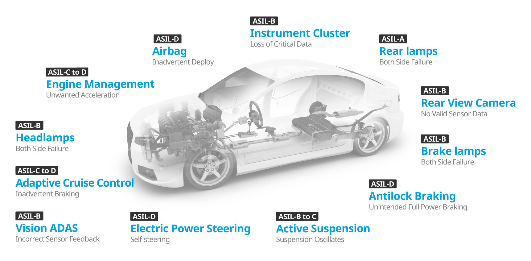 Systems such as airbags, anti-lock brakes or power steering require an ASIL-D grade - the highest rigor applied to safety assurance - because the risks associated with their failure is the highest. In addition, all electrical and electronic systems must undergo a safety analysis, for example, the rear lamps and other components are categorized as ASIL-A, headlamps and brake lamps as ASIL-B, while adaptive cruise control is categorized as ASIL-C to D.