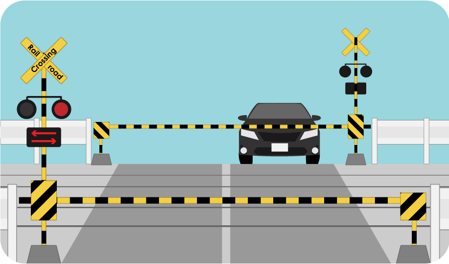 A “railroad crossing” is often equipped with bells that start ringing to warn of approaching trains and barriers that force traffic to stop. These safety measures lower the risk of accidents to an acceptable level.