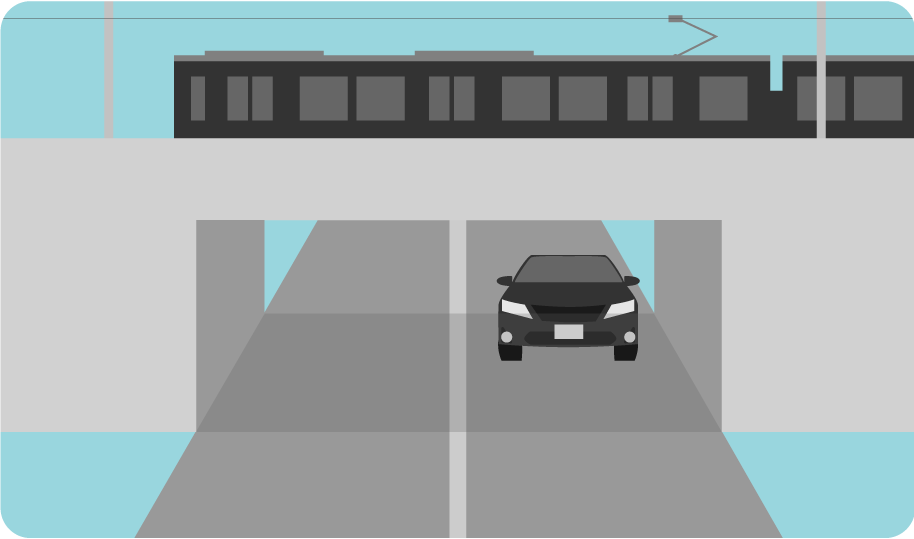 Note: A grade separation places the railroad above road traffic or vice versa. However, accidents could still cause a wide variety of harm. For example, falling objects, issues in the construction of fences or the complete collapse of the overpass due to a natural disaster or other calamity could occur, so a grade separation does not mean absolute safety. However, in terms of railroad crossing safety, a grade separation is an example of intrinsic safety since it ensures safety by eliminating the crossing (the cause of the problem) itself.