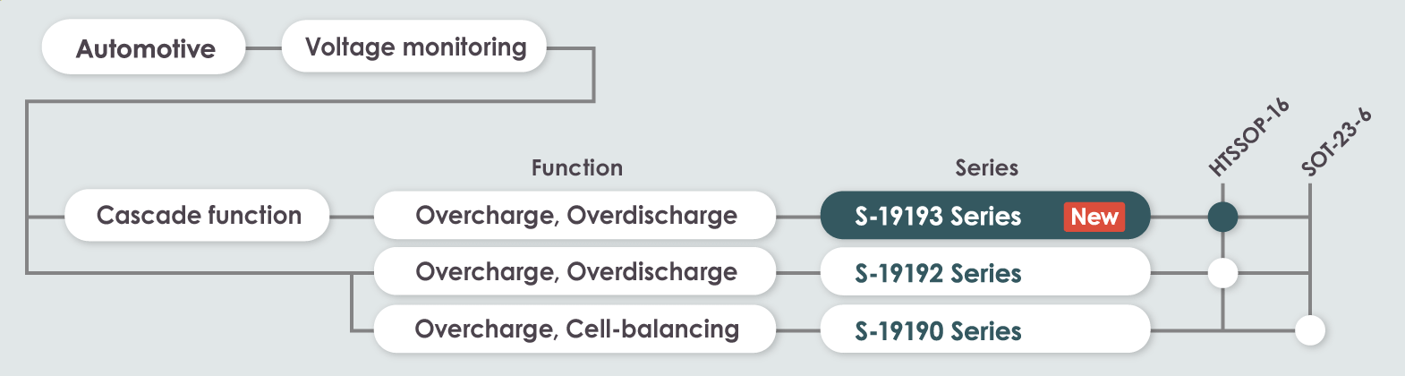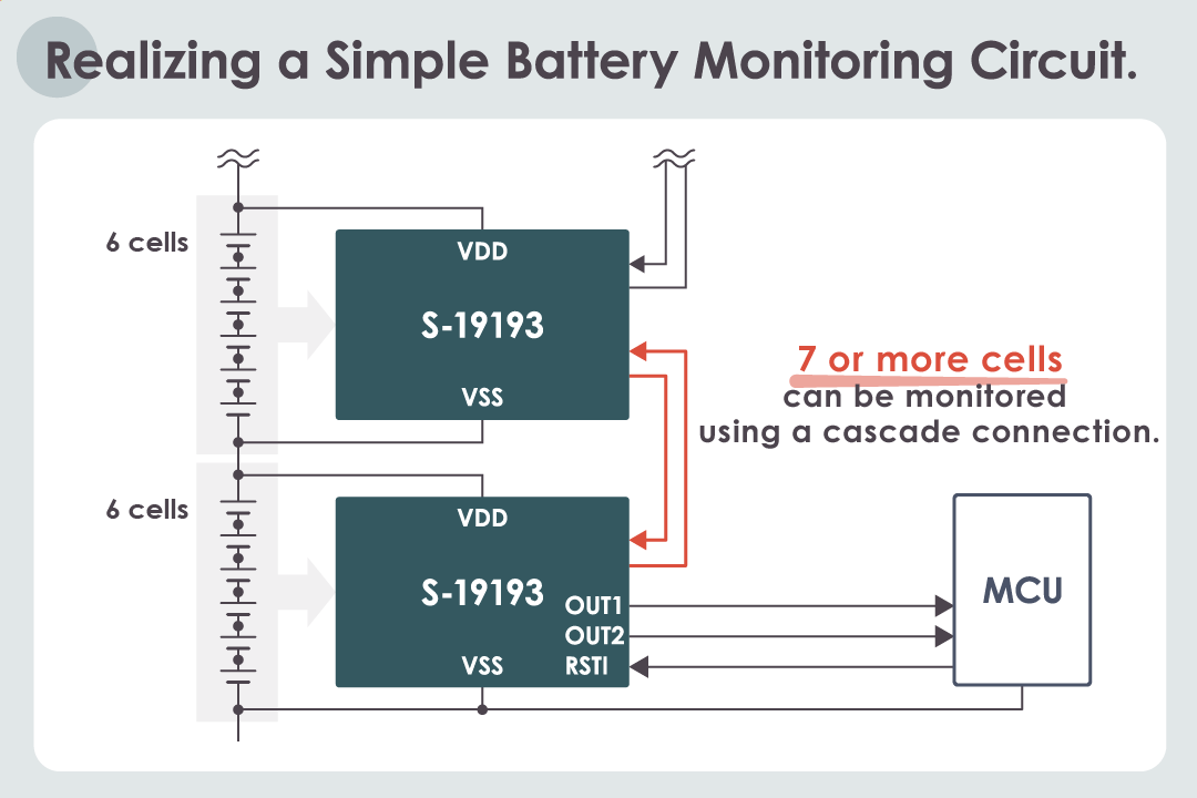 The S-19193 Series features a cascade connection function, allowing it to manage and monitor 7 or more cells.