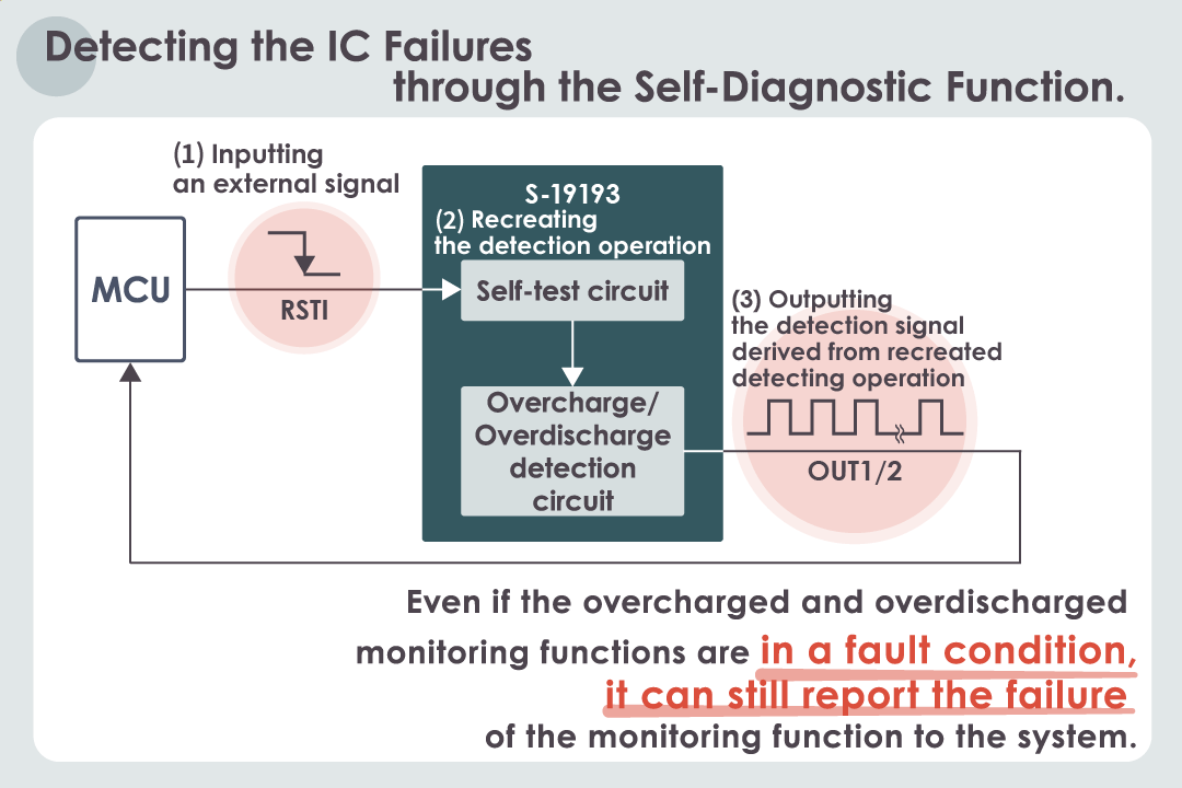 The S-19193 Series has a self-diagnostic (self-test) function that can detect the failure of the internal IC simply by inputting the RSTI signal from an external source. By using the self-test function, the IC can report the failure of the monitoring function to the system even if it loses the overcharged and overdischarged monitoring functions due to a ‘random failure’ which is likely to occur after prolonged use of the IC.
