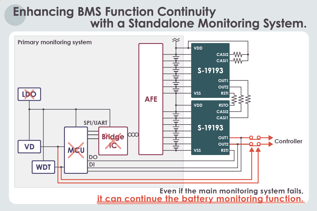 The S-19193 Series can continue monitoring the battery cell when it is overcharged and overdischarged through the standalone operation without micro controlling. Even in case of the main monitoring system failure, it can continue the battery monitoring function and realize the fail-operational BMS.