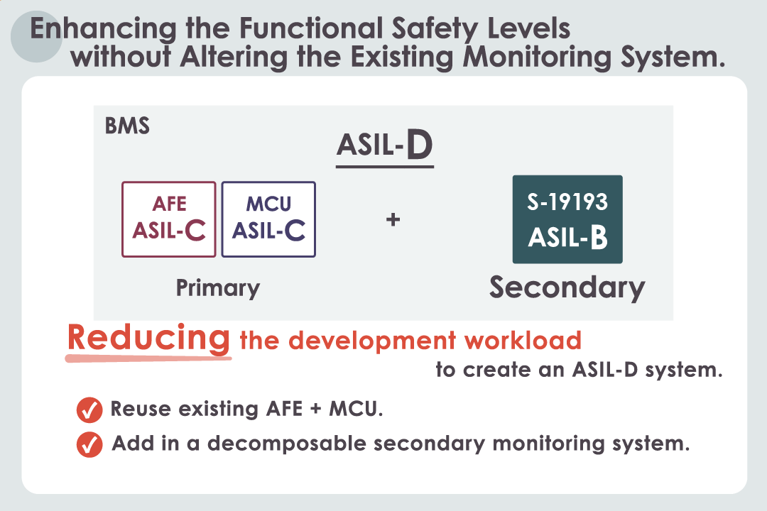 The S-19193 Series is a functional safety-compliant production developed according to a process that adheres to ISO26262. It achieves an ASIL-B(D) classification based on specific use case assumptions. By using the current monitoring circuit as the primary monitoring system and configuring the secondary monitoring system with this IC, the BMS can achieve ASIL-D classification by applying ASIL decomposition.