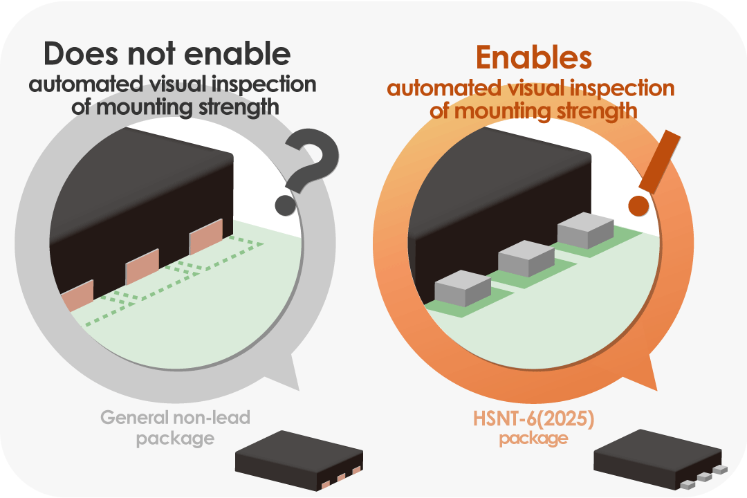 The HSNT-6(2025) is an ultra-thin package, its pins protrude from the sides of the package so an automated visual inspection can be made to confirm that the pins are properly soldered to the board.