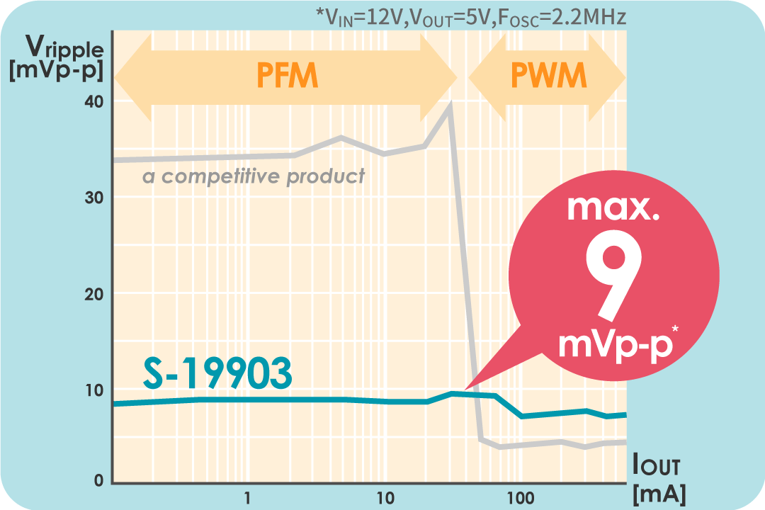 It achieves 9mVp-p across the full load current range including even during PFM control, which is especially prone to ripple.